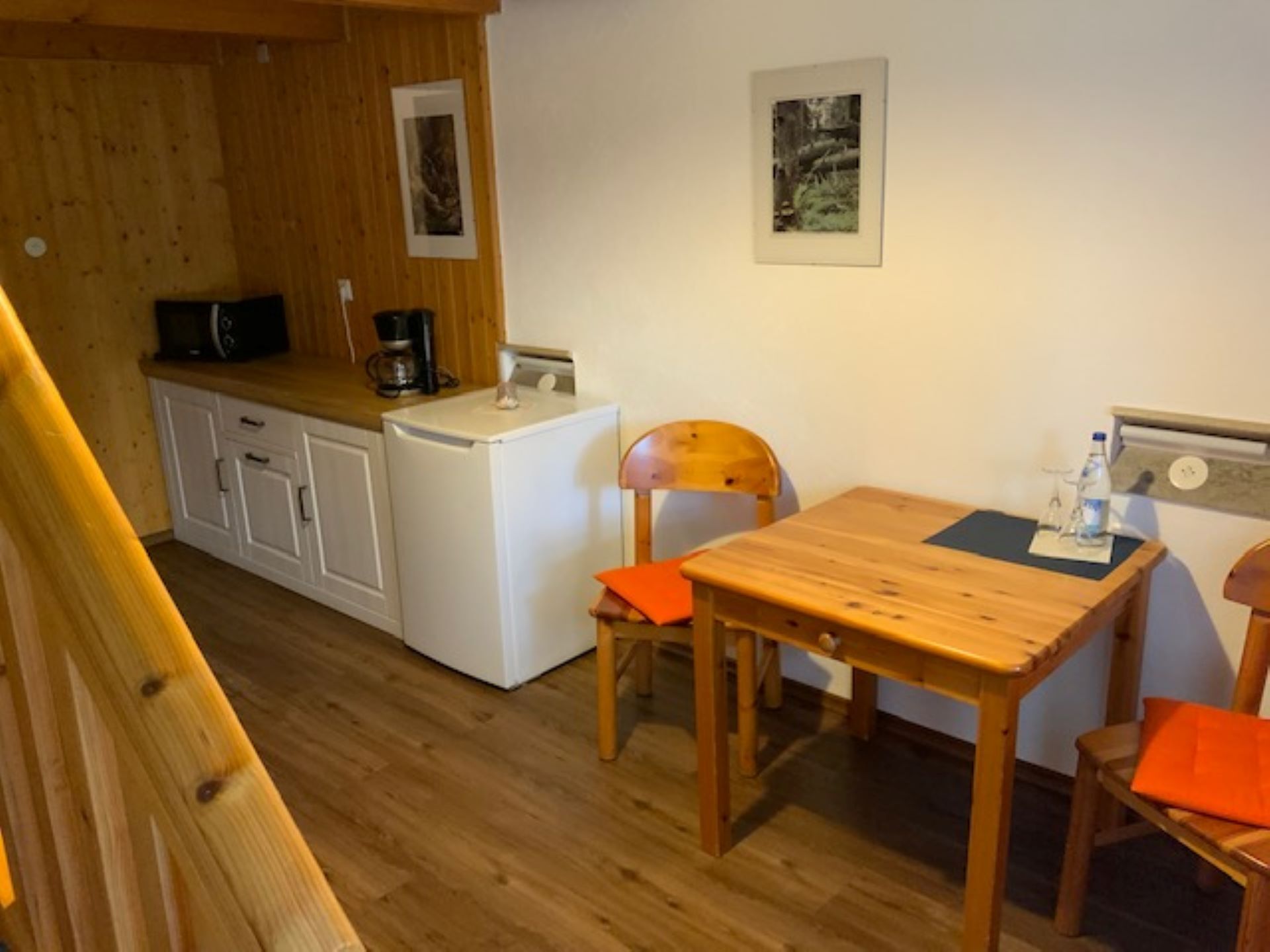 In der rustikal eingerichteten Wohnküche kann man sich wirklich wohl fühlen. Neben einem Kühlschrank und einem Sideboard, das die wichtigsten Dinge des täglichen Bedarfs enthält, sind zusätzlich noch Kaffeemaschine, Toaster und Mikrowelle vorhanden. Wenn man also mal nicht auswärts essen möchte, kann man es sich auch "zu Hause" gut gehen lassen.